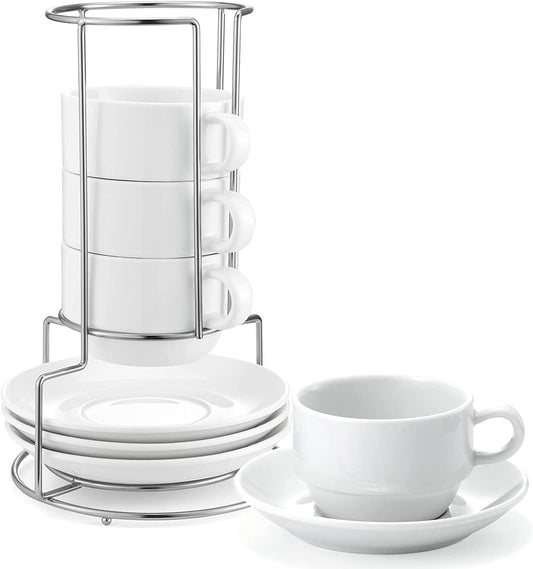 Porcelain 8 Oz Coffee Cups with Saucers and Metal Stand - Stackable Design