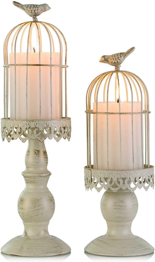 Elegant Vintage Birdcage Candle Holder - Distressed Ivory Iron Candlestick Holders for Home Décor and Table Centerpieces