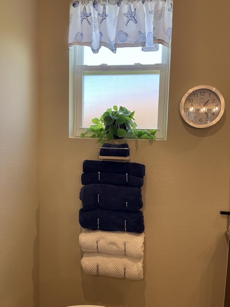 Sorbus 6-Tier Wall-Mounted Towel Rack – Stylish vertical storage for bath towels, hand towels, linens, and even wine bottles. Made of durable iron with a sleek chrome finish, this versatile rack fits bathrooms, spas, kitchens, and more. Easy to install with included hardware, it holds up to 15 lbs and features curved slots for neat organization. Measures 7” L x 5” W x 27.5” H. Perfect for adding a clean, modern touch while saving space.