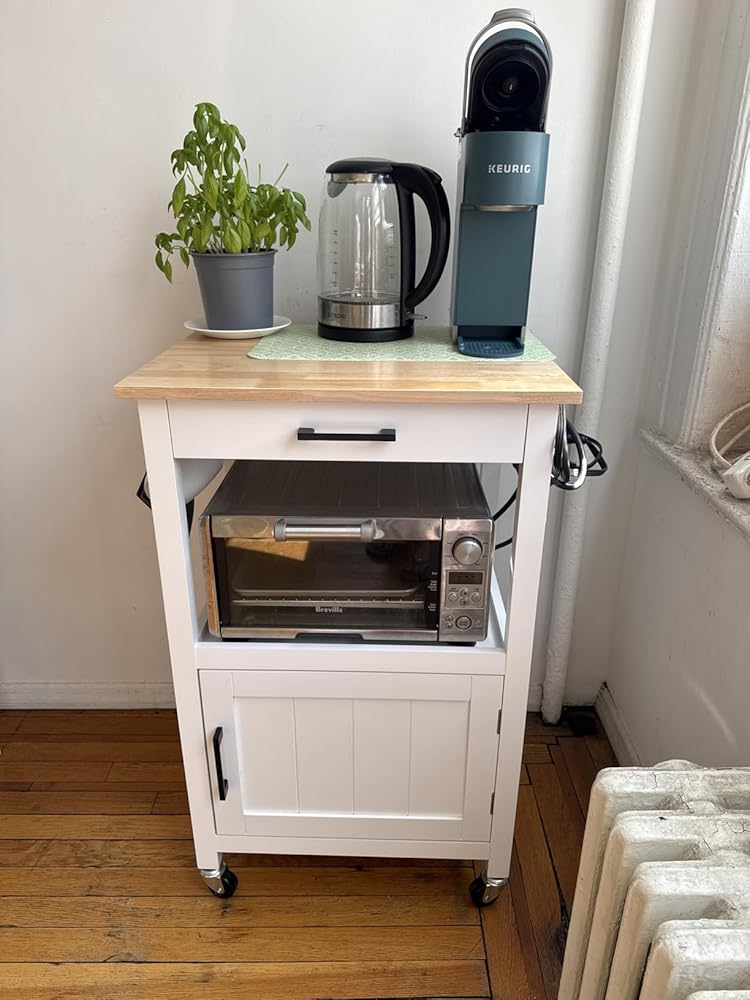This compact kitchen cart adds storage and mobility to your home. It features a single-door cabinet, a drawer, and six side hooks for keeping utensils, towels, and kitchen essentials within reach. Four swivel wheels, two lockable, make it easy to move or keep in place. Crafted from sturdy materials, it provides a practical workspace and keeps your kitchen organized without taking up too much room.