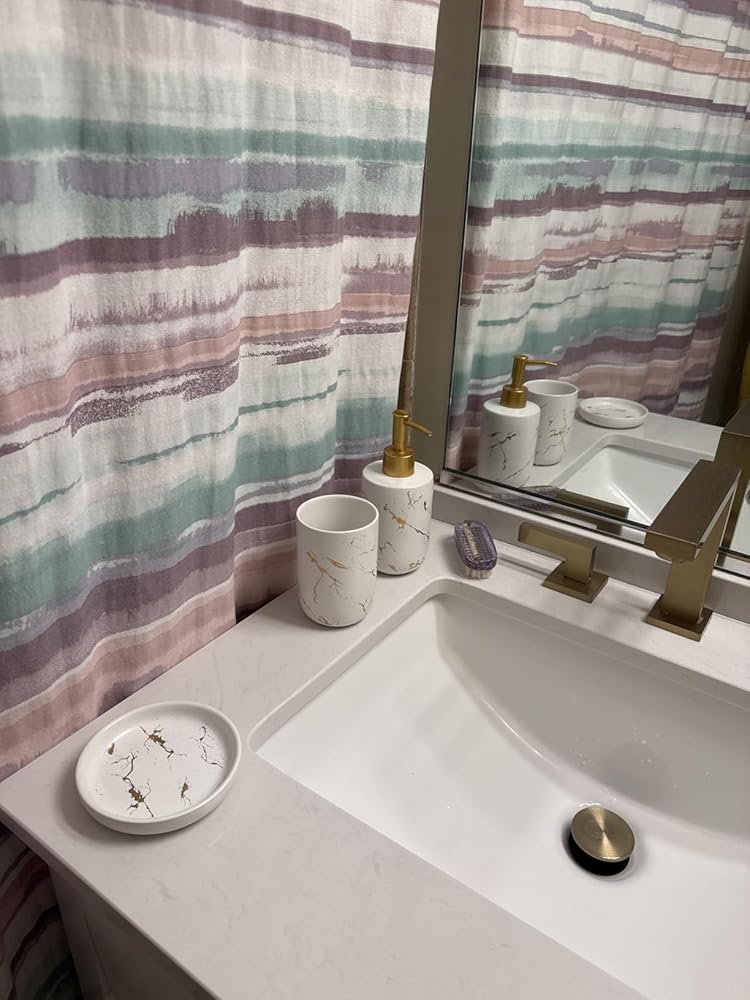 This durable 3 or 4-piece set includes a soap dispenser, toothbrush cup(s), and soap dish—perfect for keeping your vanity organized and beautiful. Its smooth surface is easy to clean, making it as practical as it is stylish.